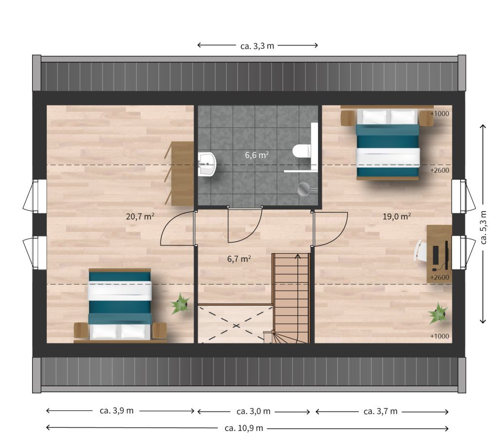 - Twee slaapkamers en badkamer met douche op eerste verdieping.